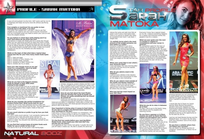 Bikini™ Australia Winner Sarah Matoka features in Australian Natural Bodz Magazine Volume 6 issue 4 as a Star Profile Athlete.